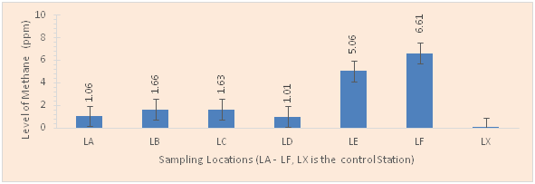 As presented in Figure 1, the spatial mean background trending of methane gas (CH4) ranges from 1.00-6.44 ppm. Generally, the levels of CH4 was higher during wet season compared to dry season. It is noteworthy that station LF, recorded the highest mean values, compared to station LD in both seasons indicating the lowest levels of CH4 gas. Furthermore, it was noteworthy that in the control station (LX), the mean level of methane was below detection limit for both seasons (Figure 1). Notwithstanding, based on spatial variation, the mean methane levels ranges from 1.00-6.61 ppm, with significant differences (p<0.05), apart from stations LB and LC. In addition, the control station (LX), indicated significant difference (p<0.05) compared to values in other stations as presented in Figure 1.