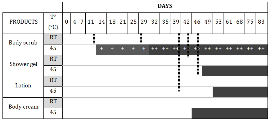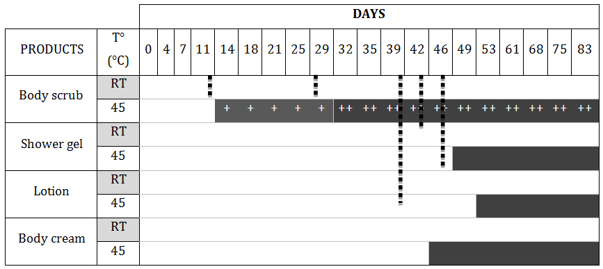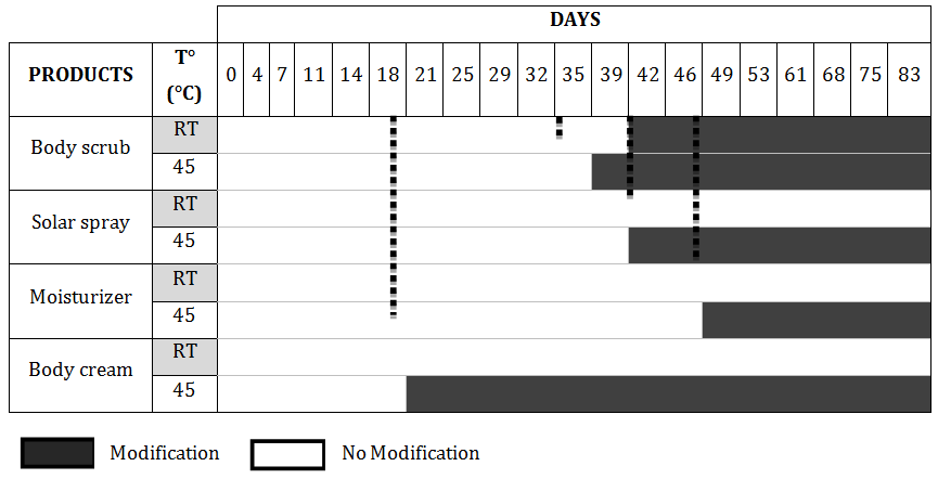 According to pH, aw and viscosity results, six formulas showed modification: body scrub, moisturizer, body cream, baby shower gel shampoo, cleansing gel and solar spray. Among these formulas, three had undergone organoleptic deterioration: body scrub, moisturizer and body cream. Baby shower gel shampoo has shown decrease of at least 5% of water activity at D39, D61 and D82, but no other observation appeared on baby shower gel shampoo. No interpretation can be done on this single observation for this formula. The fluidity changes observed by general appearance criteria can be check up with the viscosity modification monitored by a viscometer for moisturizer and solar spray. However, other viscosity modification no visible by naked eye can be determined only by apparatus, especially for shower gel, and cleansing gel. For these products, no changes have occurred for general aspect or phase separation, so physical instability cannot be determinate.