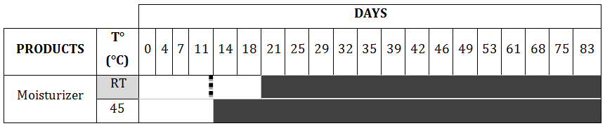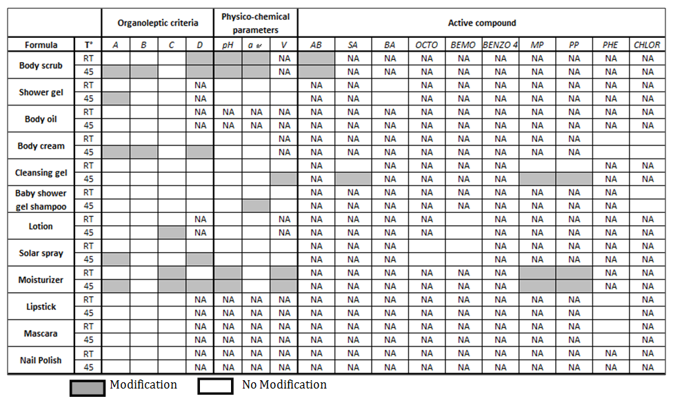In this work, only two products on twelve showed instability under normal conditions and accelerated condition. One composed of an oily phase: body scrub and an emulsion: moisturizer. For these two products, theoretical PAO was estimated and compared to experimentation. For body scrub theoretical PAO was 6 months, which is not in correlated with the study. Body scrub is not attractive after 14 days, its structure is broken. Moreover, its pH around 3.5 is beyond the limits of tolerance for the skin. For moisturizer theoretical PAO is 5 months. In regards to experimentation, odor makes the product unusable after 14 days and predicts a degradation of urea, pH around 9 is not appropriate for leave-on product. Preservative concentration decreased fewer than 10% after 40 days. In both cases, results have shown that theoretical PAO are not proved experimentally. For other matrices, six products which are mainly emulsions have shown instability at 45°C, and the four other products, which are make-up and body oil, no modification was observed. Emulsion appears to be more sensitive to heat. In this study, eight parameters have been monitored; all parameters have given information at least on one formula.