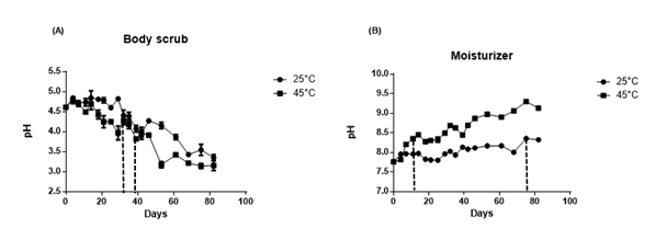 pH: On eight products, only two presented pH modifications: body scrub (Figure 2A), and moisturizer (Figure 2B). pH modification are noted when difference between the mean at D0 and the means of the triplicate measures are superior or inferior at 0.255 (pH-meter sensitivity). Body scrub is the only one to present a pH decrease at RT and 45°C. The decrease of pH appeared at D32 at 45°C and D39 at RT. Moisturizer has a pH increase, at RT and at 45°C. Increase appeared at D11 at 45°C and D72 at RT.