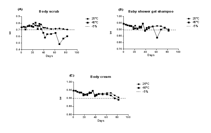 Water activity (aw): Three on eight products showed a decrease of at least 5% of their water activity: body scrub, baby shower gel shampoo, and body cream. Decrease was observed on the products stored at 45°C refer to (Figure 3) for variations in time.