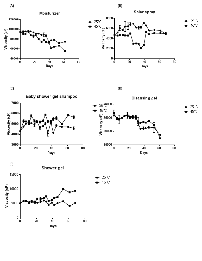 Viscosity: Regarding to viscosity results, four products showed a trend. Viscosity decreased for moisturizer (Figure 4A) and cleaning gel (Figure 4D) at RT and at 45°C. For solar spray (Figure 4B) viscosity decreased between D25 and D39, and increased from D42 and was stable to D82. For shower gel (Figure 4E) viscosity increased at D21 at 45°C.