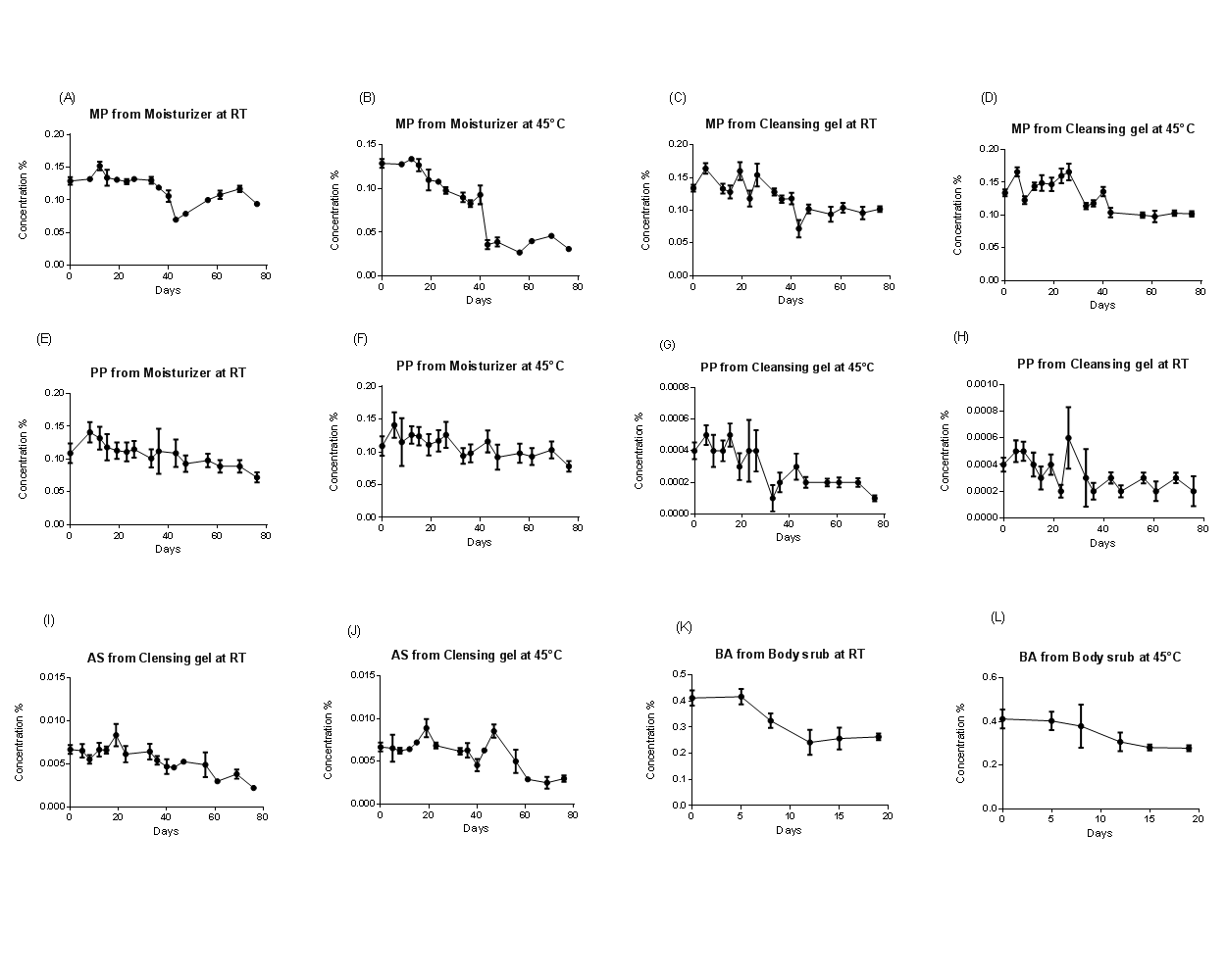 In general, for each formula, decreases of preservatives concentrations have appeared first at the higher temperature, or appeared at the same time at 45°C and RT. No diminution was observed first at RT.