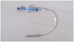 A proper and precise method of well preparation and test substance delivery remains a major concern in phytochemical and microbial research. Currently used laboratory methods deals with disc diffusion1 and well diffusion,2,3 but both serve their valuable purpose for a particular test type. The process of well preparation and test substance delivery varies from laboratory to laboratory, and most of the researchers opts their lab-based method of well preparation. Routinely used cork borer, micropipette and biopsy punch is being used for gel punching4 but practically face some difficulties in handling and may damage the well walls of the agar gel while punching and sucking (blowing-up). A modified system of well preparation, termed as Syringe Puncher is designed (Figure 1) with easily available materials with no cost of production and easily replaceable. The syringe puncher system consists of a syringe (for sucking), a sharp metal tube (for punching and sucking the gels) and a rubber/plastic tube (for connecting syringe and metal tube).