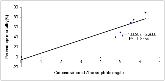 Figure 4 Regression of percentage mortality values and varied concentration of zinc sulphide exposed to juveniles of Synodontis clarias.