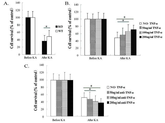 Figure 1C Anti-TNF-α antibody blocking with 100 ng/ml and 200 ng/ml concentrations, respectively, markedly reduced cell survival as compared with WT mice neurons without anti-TNF-α antibody blocking and following exposure to KA. Data are presented as mean values ± SD. N=5 in each group.