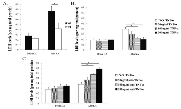 Figure 2A TNF-α deficiency increased production of LDH 24 hours after KA insult.