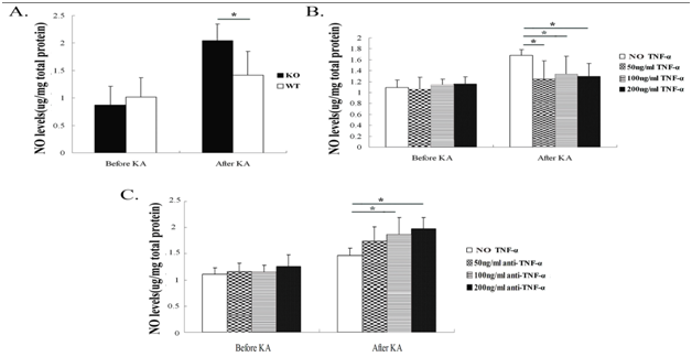 Before and 24h after KA insult, the NO production was measured in hippocampal neuronal supernatants of TNF-αKO and WT mice. Hippocampal neurons from TNF-α KO mice had increased KA-induced NO production in supernatants (p<0.05); there was no difference in neuronal NO production between the two groups of mice before KA insult (Figure 3A). After pre-exposure to TNF-α in WT mice neurons, NO production was lower compared with neurons from WT mice without TNF-α pre-exposure (Figure 3B). Hippocampal neurons pre-exposed to anti-TNF-α antibody (100ng/ml and 200ng/ml) increased the expression of NO (Figure 3C).