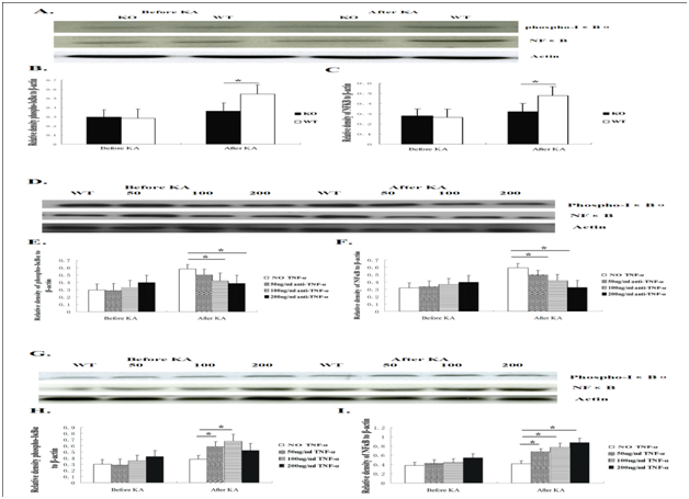 Figure 4E & F Twenty-four hours after KA insult, phospho-IκBα and NFκB expression was detectable in four groups of mice. After KA administration, the neurons from WT mice with anti-TNF-α antibody blocking at 100ng/ml and 200 ng/ml, respectively, showed significantly lower phospho-IκBα expression than WT mice neurons without anti-TNF-α antibody blocking.