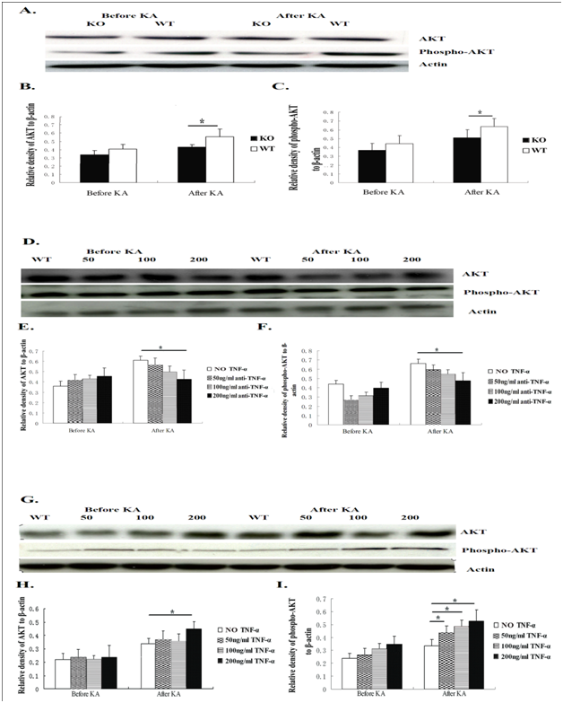 Figure 5E & F Twenty-four hours after exposure to KA, the neurons from WT mice that were pre-exposed to anti-TNF-α antibody at 200ng/ml showed significantly lower AKT expression than the neurons from WT mice without anti-TNF-α antibody blocking. After KA insult, the neurons of WT mice pre-exposed to anti-TNF-α antibody with 200ng/ml showed significantly lower phospho-AKT expression than WT mice neurons without anti-TNF-α antibody pre-exposure.