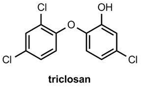 “Triclosan works by blocking the active site of the enoyl-acyl carrier protein reductase enzyme (ENR), which is an essential enzyme in fatty acid synthesis in Bacteria. By blocking the active site, Triclosan inhibits the enzyme and therefore prevents the bacteria from synthesizing fatty acid, which is necessary for building cell membranes and for reproducing”.1 Humans do not have ENR enzymes, which has given scientists reason to believe that Triclosan is fairly harmless to them.