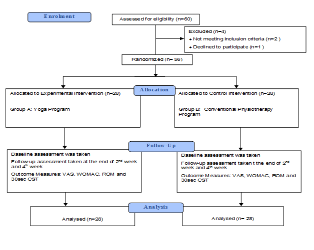 Methods: Fifty‒Eight subjects between 40‒55 years of age diagnosed with Osteoarthritis of Knee (OA Knee) was randomly allocated into two groups. Group A received Yoga Program for 4 weeks and Group B received Conventional Physiotherapy for 4 weeks. The outcomes assessed in terms of Visual Analog Scale (VAS), WOMAC, 30Second Chair Stand Test and the knee range of Motion (ROM) at baseline, at end of week 2, and at the end of week 4.