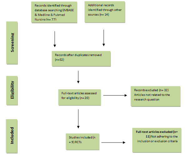 A number of 91 possible studies were obtained from the search of the electronic databases and the manual search of the references listed in every relevant article. Of these 39 studies were eliminated after the titles and abstracts were screened because they failed to satisfy the inclusion and exclusion criteria. Regarding the rest of 52 studies their full texts were downloaded and scrutinised and after the elimination of duplicates from different databases a number of nine full-text studies were obtained. These were again subjected to appraisal with respect to the inclusion and exclusion criteria as shown in Figure 1. The nine RCTs obtained from the electronic and manual search for inclusion in the review were26-28 all from Brazil11,20,29,30 and31,32 both from the Republic of Korea.