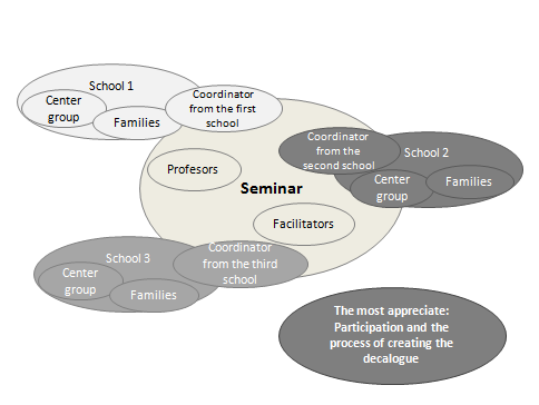 The material to be sent is the field notes with the reflections of the families, already contrasted by the Centre Group if possible, the recordings of the training session and the decalogue drawn up by the Centre Group (Coordinator 1). In our work as facilitators, we set out in a single document the aspects in which the three schools agreed and aspects that were mentioned by only one of them. The aim was to give back an overview to each centre of how the decalogue was being carried out at all the centres, to enable people in each Centre Group to perceive the trajectory covered. The joint decalogue was produced at the February seminar, drawn up by the facilitators from the decalogues produced by each centre. The coordinators showed it to the families at the centres and it was the subject of discussion at the seminar in March, in the knowledge that it was still subject to modification.
