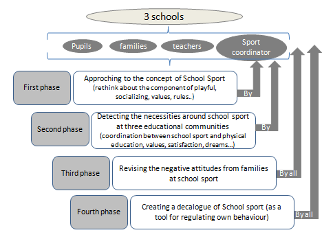The teaching centres studied in this paper strive to ensure that sport activities are governed by the same ethical codes as the other educational and academic activities carried on at the school.1 In previous research we succeeded in approaching a concept of School Sport reconstructed by the various agents at the three schools, in view of the importance attached by the three to School Sport and in connecting the philosophy of School Sport to the school's own educational philosophy (Educational School Project) and our investigations commenced at this point. In the research group, after conducting a review of our own conceptions and consulting all the educational agents at the schools (pupils, families, teachers, sport coaches and head teachers), we created a common language in relation to what we understand by School Sport, since here we are referring to a physical fun activity with a socializing component, in which those in charge of education have a defined pedagogical intention on the issue. With respect to the fun component, we feel this differs from other definitions, since in our conception the fun component need not signify a quality physical activity, because the quality of School Sport will depend on the values that are attributed to it and on the educational nature of any proposals submitted. On certain occasions the game is characterized by unfair competition, long periods of inactivity for most of the children, dominance of play by only a few and in general an implicit acceptance of inappropriate sporting values.2-4 Thus we feel that sports and games have great pedagogical potential, which must be discovered by educators if it is to be realized.5-7