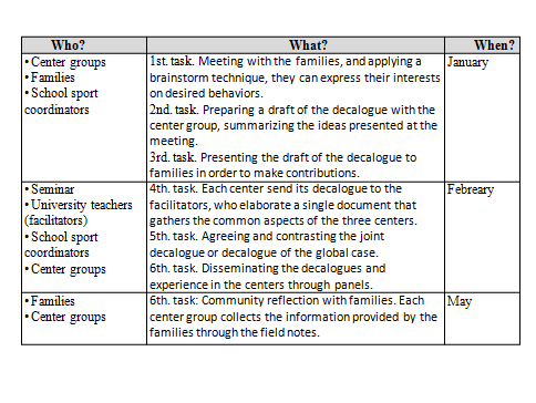 To draw up the decalogue, training sessions were held with the families where the consequences of the behaviour patterns they adopt in the education of their children were questioned. The issues discussed up to that point were classified in the following dimensions attitudes on interpersonal relationships, attitudes in relation to the result of the game, attitudes in relation to the decisions taken by referees and coaches and attitudes on fair play. The field notes set out the ideas that would assist the Centre Group in drawing up the decalogue. Construction of the decalogue commenced with a brainstorming process during the corresponding training session, after which the Centre Group drew up a decalogue as a proposal by each school on the basis of the minutes of the meeting and the opinions gathered during the sessions. The three decalogues were compared and proposed for discussion by the facilitators and this produced the common decalogue for the three centres. This was to be publicly displayed at each school, with boxes for suggestions. Time was taken to reflect on the attitudes and to make comments concerning what was found to be desirable by each group.