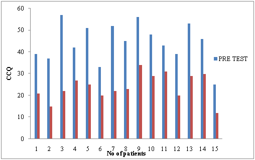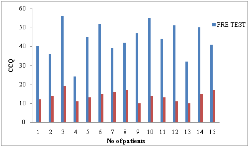 Using Borg’s scale, in Group A there is maximum improvement in 2 patients, moderate improvement in 10 patients and minimum in 1 patient. In Group B there is moderate improvement in 7 patients and moderate improvement in 6 patients and no improvement in 2 patients. Using Clinical COPD Questionnaire (CCQ), in Group A there is maximum improvement in 1 patients, moderate improvement in 5 patients and minimum improvement in 3 patients. In Group B there is moderate improvement in 1 patient and minimum improvement in 4 patients. The ground walking and the relaxation techniques play an important role in dyspnea reduction and also reduces the anxiety and improves health status in patients with chronic obstructive pulmonary disease. Hence based on the information presented, the independent‘t’ test was performed to analyze the results. The calculated ‘T’ value for Borg’s scale 5.1278 and CCQ is 5.9153, which is greater than the table value of 2.048 in accordance to the level of significance of 0.05.