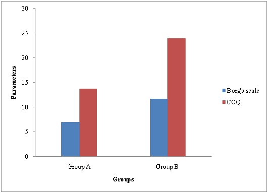 This is a comparative study in which the objective is to determine “The effectiveness of ground based walking with relaxation techniques to improve quality of life in patients with chronic obstructive pulmonary disease.” The purpose of study is that there is significant improvement in quality of life and reduction of anxiety level in patients with chronic obstructive pulmonary disease. In each group Borg’s scale and Clinical COPD Questionnaire (CCQ) are used. The Borg’s scale is used to identify the reduction of dyspnea level and CCQ is used to measure the health status in patients with chronic obstructive pulmonary disease (Table 1).