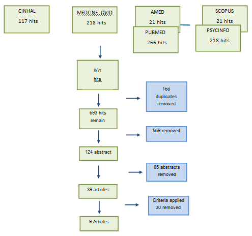 An initial search retrieved a total of 861 hits, which were recorded and screened against the inclusion and inclusion criteria, after 168 duplicates were removed. Titles and abstracts were screened to establish that a total of 39 studies met the inclusion criteria. These were retrieved for full paper critique to ratify they met inclusion and exclusion criteria. This resulted in nine empirical research studies being selected for the review, author name beside each citation.16-24 For the nine final studies selected the Critical Appraisal Skills Program (CASP 2013) was used to evaluate the qualitative and quantitative methodologies of each of the studies.
