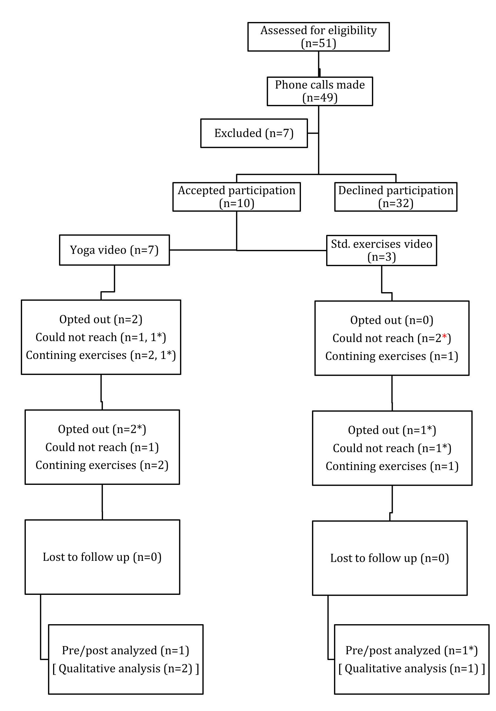 Patients were recruited by telephone from the surgical wait lists of two orthopedic surgeons (fourth and fifth co-authors) at the Roth McFarlane Hand and Upper Limb Centre (HULC) located in St. Joseph’s Hospital. Patients provided informed consent as approved by their signatures on consent forms. The initial intention was to recruit a sample of up to 30 participants, assuming a 50% response rate and a potential pool of 60 participants that would be contacted within a three-month interval. Over the course of the 3rd month recruitment period 51 patient files were obtained from two surgical wait lists. Each file was analyzed to see if patients were eligible if their surgery was scheduled within 6 weeks from the time the file was received that patient was excluded. A total of 49 calls were made during those 3 months. (Two files did not have patient contact information so calls could not be made). Of 49 calls seven were excluded because the patient informed the examiner he/she would either be having their surgery within 6 weeks or had already undergone their surgery. Thus 42 patients were eligible however 32 declined the invitation to participate and only 10 consented. Of these 10 patients three were randomized to the standard exercise group and seven to the yoga group via envelopes. By the end of the 6 weeks only two patients completed the entire intervention. (One patient discontinued with the exercises because of her upcoming RC surgery while another patient opted out due to vacation. Three patients elected out due to pain. Finally three patients only provided qualitative feedback in response to predetermined interview questions over the telephone to inform understanding on their perceptions and adherence to the assigned exercise program since they did not underdog pre/post). In the end, two patients completed the program and the full pre/post testing (Figure 1).