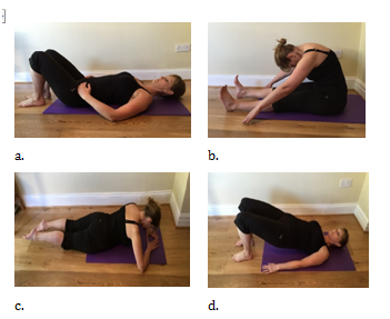 Figure 1 Pilates Intervention a. LSN, b. spine stretch forward, c. diamond press, d. shoulder bridge.