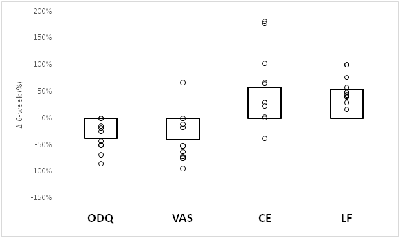 Figure 3 Mean (shown as bar) and individual (circles) relative percentage changes in Oswestry Functional Disability (ODQ), Visual Analogue Scale (VAS), Core Endurance (CE) and Lumbar Flexion (LF) after a 6-week Pilates exercise intervention.