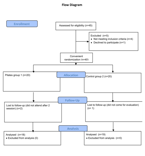 Obtaining an ethical approval by the Hospital Ethics Committee and having provided written informed consent, 40 healthy female health-workers were included to the study. Exclusion criteria were having cardiac and pulmonary problem, being under eighteen years old, having had spinal or abdominal surgery at any time, having back pain in the last two years, having visible scoliosis, neuromuscular disorders, pregnancy or having previous Pilates training. Study took place in Istanbul Physical Therapy and Rehabilitation Training and Research Hospital between September-October 2010. This study was implemented as a part of an already existing Pilates exercise organization for the health workers, by convenience sampling and evaluation consents. Forty women participated to the study after the exclusion process. These individuals were separated into two groups according to their availability from working time, which resulted in equally sized populations in each group by polyclinic secretary who was blinded to the study. One of the researchers recorded two groups informed participants. Flow chart of this study is shown in Figure 1.