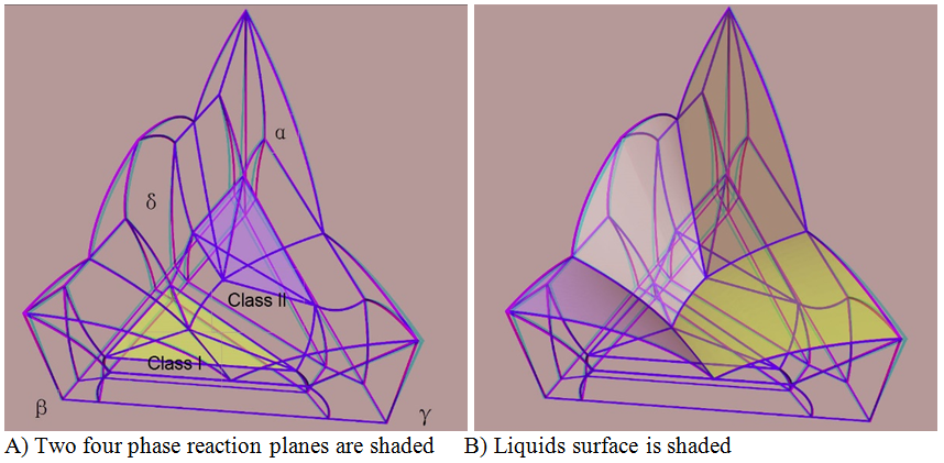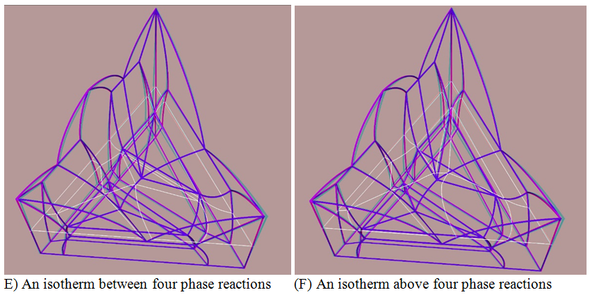 A class I and II combined ternary phase diagram was constructed by Software Solid works. Class I is a reaction of eutectic four phase transformation and Class II is one of eutectic-peri tactic in ternary system.1 Wire frame and shaded surfaces can be illustrated. Here, these 3D phase diagram files were displayed by Insight. For any view or rotation, zooming, sectioning process, views can be disposed into two separated images or movies. Then, they can be used for any type of 3D stereo display by the aid of special hardware and software. Here, a series of 3D stereo images of a class I and II combined ternary phase diagram were shown in Figure 1. The 3D stereo effect can be observed by wearing red-cyan glasses (red glass for left eye and cyan glass for right one). It is easy to tell the spatial relationship of the curves, surfaces and planes which are at different depths, some popping out of paper, while others extending behind paper. This greatly helps the understanding of phase diagrams. The overlapping of the two four-phase planes can be clearly felt. They share a three phase region, as shown in Figure 1C. Isotherms can be given at any temperature. Here, three ones, below, between and above the two four phase reactions were given respectively. With the help of the isotherms, these two four phase reactions can be easily understood. Meanwhile, isopleths can be drawn as well. And a certain alloy can be selected by corresponding to a certain location in the bottom triangle (Gibbs triangle). Its solidification paths of each phase, liquid, solids can be shown on the surfaces. And their fractions can be calculated based on level rule applied on tie lines or tie triangles.
