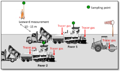Cui mentioned that "the paving process used paver for loading trucks by asphalt concrete. Rolling process was final procedure, in which compactors roll asphalt material many times to get hard, fixed, and smooth road ". Machine and working force wanted for each phase were shown in Table 2. In rolling process, concentration levels of VOCs monitored in air surrounding the driver and at the pavement surface was equal zero VOCs emissions were occur from machines, vehicles and equipment utilized for pavement. VOCs resulted from the machines were 0 - 16 ppm During the paving process, measured VOCs were occured from two sources (as shown in Figure 3) Volatilization of asphalt from the truck into the paver, and 2) Volatilization of asphalt during paving.67–70