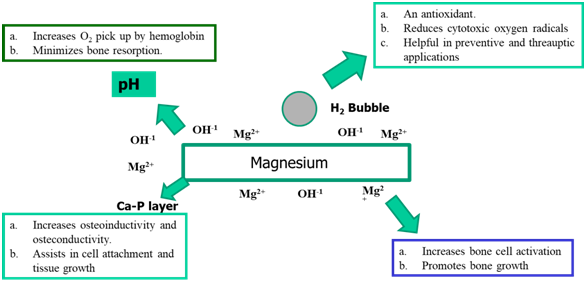Magnesium is the lightest and one of the most abundant metallic materials with a density (1.74g/cc) and elastic modulus (40-45GPa) closest to bone.1,16 This translates to almost no stress shielding effect. The compressive and tensile strengths of magnesium and its alloys can easily be tailored to exceed that of bone and its ductility in both compression and tension remains higher than bone making it a mechanically suitable material for implant applications. Human body needs about 250-400mg of magnesium per day as magnesium is the fourth most prevalent ion in human body and assists in bone health, multiple metabolic processes in body and exhibit antibacterial properties against Escherichia coli, Pseudomonas aeruginosa and Staphylococcus aureus.17 As magnesium is biocompatible and biodegradable, its use as non-permanent biodegradable implant in human body ensures: