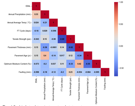 For training the neural network model data sets are collected from The LTPP database. The LTPP program regularly collects joint and crack faulting data at each jointed concrete pavement test site using the Georgia Fault Meter (GFM). Figure 1 shows the diagram for GFM faulting measurement. The faulting measurements over 30 years of lifespan at the wheel path for the Dry-Freeze and Dry No-Freeze climate regions subjected to this study are shown in Figure 2 & 3. A total of 190 observations in 8 states are fed into the ANN model for both front and back training propagation. Linear regression shows the existing correlation between which was further evaluated by correlation heatmap presented in Figure 4. ESAL and pavement thickness demonstrate the highest positive correlation, reaching 0.5. Conversely, the annual average temperature exhibits a significant negative correlation (-0.74) with faulting formation, indicating a strong inverse relationship between the two variables.