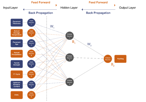 The ANN model requires the datasets to be standardized for training. Table 2 represents the maximum, minimum, average, and standard deviation of the training dataset. These values are used further for equation development process. A multilayer perceptron (MLP) based ANN consists of fully inner connected neurons which have three types of layers, input layer, hidden layers, and output layer. The input layer receives the input data sets which are processed through one or more hidden layers using mathematical operations. Finally, the model’s prediction is produced by output layer based adjusted weights and biases. The algorithm gradually corrects the weights among the different units and for this, the algorithm evaluates the difference between the output predictions produced by the MLP and the actual desired values. This learning method is feedforward backpropagation.7 For this study the dataset is initially normalized. Normalization is a process to change the dataset into a specific range. It is necessary where the input features has big differences in ranges.8 For faulting prediction ANN, min-max normalization is used to rescale the input variables range between -1 to +1, shown in Equation 1. With this method, the relational properties in data remains the same, changing the range only.9