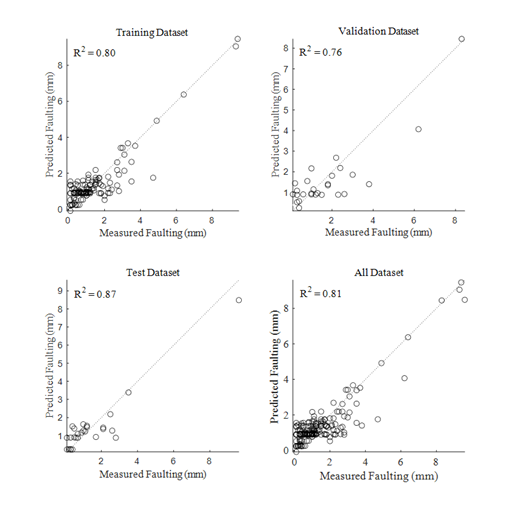 The main objective of the study is to utilize a machine-learning approach principally an ANN base model for future faulting prediction in JPCP. The model is trained by datasets collected from LTPP for the dry climatic zone in the US. Both structural properties and environmental effects are considered for neural net development thus creating a well-grounded prediction model. The study also derives a first-degree simplified equation from the ANN model, which can be utilized by pavement engineers and maintenance contractors to predict future faulting development in JPCP. The sensitivity analysis of the model input parameters is performed to investigate the inner connectivity between input parameters and output results.