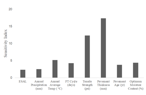 As the MLP has multiple inputs, the impact of each input parameter is measured by the sensitivity index. Equation 4 defines the sensitivity index. In this study the absolute value of the sensitivity index is measured. The sensitivity index is proportional to the variable impact on model output. Figure 7 shows the sensitivity of the input parameters to faulting.