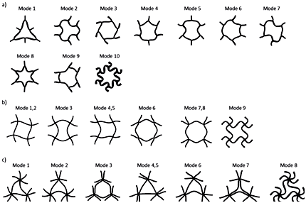 Here in this part we present first Eigen modes of 2D structures with periodic boundary conditions. Taking into account the periodic boundary conditions, Figure 2 shows the first Eigen modes of the hexagonal, quadratic as well as triangular 2D basic cell. There is a direct relationship between the number of nodes and number modes. The number of modes increases with the number of nodes in the basic element. In particular, the number of nodes for the triangular, quadratic and hexagonal basic elements is 3, 4 and 6 respectively which explains the dependence of the number of modes on the unit cell types noted in the Figure 2. For each lattice cell, these Eigen modes were assembled to form a periodic lattice structure. Numerical testing performed by applying a negative strain in the x-y direction.5