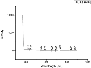 The spectroscopy technique, where electromagnetic radiation is used for getting information about structure and property of a material was used for characterization of the thin film samples.11 The prepared thin film samples were studied using the following: (i) a UV-Visible, (ii) Fourier transform infrared (FTIR) spectroscopy, and (iii) fluorescence spectrophotometer. The ultra-violet (UV)-visible spectrophotometer [Model: Shimadzu UV Visible Spectroscope] study was carried out at the BMS Institute of Technology [Bangalore-560064, India] and provided the spectra for the chosen three thin films and pure polyvinylpyloridate. The Fourier transform infrared (FTIR) spectroscopy [Model: Perkin Elmer FTIR] study was carried out at the BMS Institute of Technology [Bangalore-560064, India]. The FTIR did reveal an observable change in functional group of the thin films of the as-synthesized polymer nano composite. The photoluminescence [Model: FP-8300 Jarko] study was carried out at Mysore University [Mysore- 570005, India]. Fluorescence spectroscopy was done for the purpose of analyzing fluorescent properties of the chosen thin film samples.