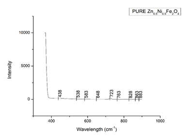 We have taken an optimum wavelength range of 300 cm-1 to 500 cm-1 for our consideration. For pure PVP the peak intensity was at 412, and for pure Zn0.5Ni0.5Fe2O4 nanoparticles it was at 438. By reinforcing, or doping, the chosen polymer with ZnNiFe nanoparticles we observed an increase in intensity. The peak intensity for the PVP nano composite was 437. The Photoluminescence intensity is directly proportional to the concentration of molecules. Hence, we observe than when the reinforcing, or doping, is done properly there does result a noticeable increase in intensity. This makes the engineered polymer nano composite to be a potentially viable candidate for selection and use in a spectrum of opto- electronic applications.26-35