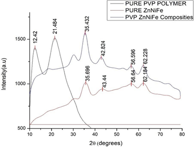 From Figure 13 we can conclude that the pure polyvinylpyloridate (PVP) polymer is essentially amorphous in nature, The ZnNiFe nanoparticles are crystalline in nature as we observe the sharp and distinct peaks in the graphs. When we combine both the polyvinylpyloridate polymer and ZnNiFe nanoparticles, resulting in the polyvinylpyloridate + ZnNiFe nano composites, we did observe higher peaks when compared to the pure nanoparticles. This suggests that the occurrence and presence of crystallinity has increased by a combination of the chosen PVP polymer with ZnNiFe nanoparticles and is shown in Figure 13.