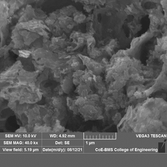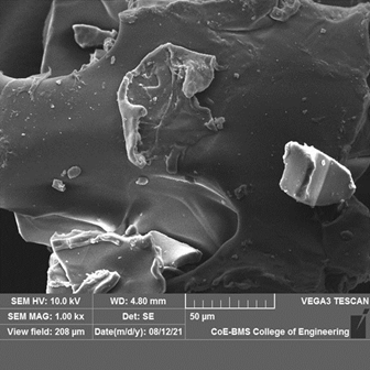 The scanning electron microscope images of pure polyvinylpyloridate polymer, pure ZnNiFe nanoparticles and the polyvinylpyloridate + ZnNiFe nano composite did reveal an observable change in morphology of the grains. Size of the polymer polyvinylpyloridate was 50μm, as shown in Figure 18. Grain size of the ZnNiFe nanoparticle was 500nm, as shown in Figure 19. The difference in grain size is evident from these two figures. The observed change in morphology when nanoparticles are added to the chosen polymer (PVP) is shown in Figure 20. The grain size is around 1μm. We also observe from that for pure PVP it is essentially granular in structure with a lot of spacing, or less networking like structure, between the particles. However, for the pure nanoparticle it is a networked structure with marginal evidence of gaps between the particles. When we reinforce, or dope, the chosen polymer (PVP) with nanoparticles, we did observe a network-like structure with minimum gaps between the particles. The network is more pronounced than the structure observed for pure PVP and pure nanoparticles.