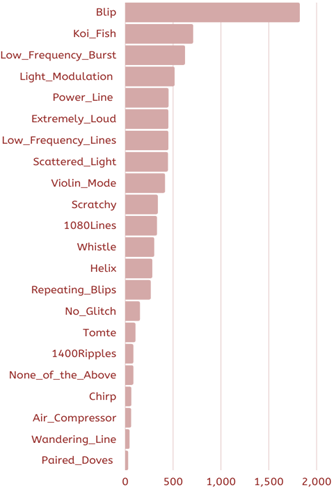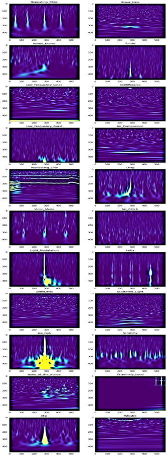 In this section, we design and develop a deep learning system to classification gravitational waves of the dataset Gravity Spy (Gravitational waves) that is made up of the Laser Interferometer Gravitational-Wave Observatory (LIGO) images. Our system is divided into four blocks (Figure 6), those are- (1) Input, (2) Pre-processing, (3) Learning Network, and (4) Output. The input image block takes images from the dataset and sends them to the next block. The Pre-processing block processes the images from the input block and creates the input images in a suitable form for the Learning Network block. The Learning Network block has two-part, those are – (1) Convolution and (2) Classification. The convolution part is used to extract the important features from the pre-processed image, and then the Classification part classifies the gravitational wave from the images. And finally, the output block represents the class of the gravitational wave. The dataset images belong to 22 classes, represented in Figures 7 & 8.