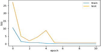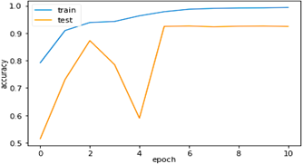 The model accuracies and losses are plots in the Figures 10 & 11. Those figures represent the model performances for the training and the test for the first ten epochs. The model reaches stable performance after the ninth epoch.