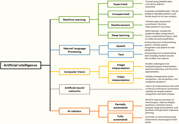 Figure 2 displays the five major subdomains of artificial intelligence. There are several possible clinical uses for each subdomain of AI in brain tumor surgery. There are many more subfields within AI, hence this diagram is not all-inclusive. In12 the dependent variable (the target) and the independent variable (a collection of predictors) make up supervised learning. These variables are used to create a function that maps inputs to intended outputs. The model is trained repeatedly until it reaches a high degree of accuracy on the training set. kNN, logistic regression, decision trees, random forests, regression, and so on are a few instances of supervised learning. There won't be any target variable to forecast in unsupervised learning. Examples of unsupervised learning include k-means, apriori algorithms, and others. The machine is placed in an environment where it continuously educates itself through trial and error in reinforcement learning. In this case, the computer attempts to get the knowledge necessary to make accurate decisions by learning from its prior experiences. Markov decision process serves as one illustration of reinforcement learning (Figure 3).13