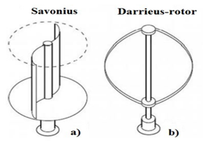 VAWTs are, at a smaller scale, applied in urban areas where wind direction can be variable. The major advantage of a VAWT is its ability to accept wind from any direction allowing manufacturing to be simpler. They can range anywhere from 0.914 to 21.336 m and have an efficiency between 15-40% based on the layout and orientation. The VAWT design method is categorized into two types based on the driven forces, Savonius and Darrieus. This is illustrated in Figure 2. Savonius wind turbines are propelled by the aerodynamic force of “drag”. Drag is the force from the wind that acts in a direction parallel to the wind. While this force usually resists aircrafts, it drives the Savonius VAWT. The positive aspect of a drag-driven turbine is that it needs very little wind speed to start. The drawback is that since drag is driving only one blade at a time, there is resisting force on the other blades to rotate, so it can only perform at around 15-20% efficiency.