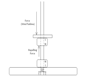 In the constant and rapid development of wind turbines, a new technology has been immersed in VAWTs. Magnetic Levitation (MAGLEV) is a technique for holding a weight without support from outside structures.10 The idea behind it involves having two magnets with like poles facing each other. With the magnetic like poles facing each other, it allows the wind turbine to function with reduced force on the generator. With this reduced force on the generator, the wind turbine can run smoother and with less friction. Furthermore, with no weight on a generator, it can have an extended shelf life, improving sustainability and maintenance costs. Figure 3 illustrates this well.11