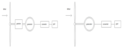 Another aspect of wind turbine technology is to utilize gearboxes or direct drive mechanisms. Most Turbines today use a gearbox to increase the power output and torque proportionally using a gear ratio.12 For example, if a wind turbine rotor is running at 100 rpm, a 10:1 gear ratio can be implemented, so as the rotor spins at 100 rpm, the generator spins at 1000 rpm. This can be very effective in maximizing the power output of the wind turbine. On the contrary, the gearbox produces a significant amount of friction, slowing down the turbine. Additionally, a gearbox can cause malfunctions in the system and increase the amount of maintenance needed on the wind turbine. In order to eliminate the constant maintenance and reduce frictional losses, a direct drive system has been implemented in wind turbines. The rotor is directly connected to the generator; so as the rotor blades rotate, the generator rotates at the same angular velocity. While this could make a turbine produce less power, it reduces the cost of maintenance and increases its reliability & sustainability (Figure 4).13