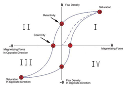 In choosing the magnets for use to make the MAGLEV most effective, the hysteresis loop or (B-H curve) was the basis. The B-H curve represents the strength in magnetic properties of a material (Figure 5) and illustrates the relationship between the magnetic flux density B and the magnetizing field strength H.18 In a MAGLEV wind turbine application, the second quadrant is very important because it represents demagnetization. Since the magnets are always opposing in MAGLEV, it can convey the maximum air gap allowed between the two magnets and the operating strengths at different positions that are away from each other.19 The space between the magnets needed to be constant to reduce its vertical movement so that the stresses on the system were kept to a minimum. With that, it was found that the Ne-Fe-B (Neodymium-Iron-Boron) was the best option for MAGLEV due to its resistance to demagnetization and strong magnetic properties at room temperature.