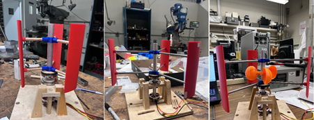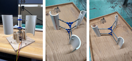 The rotor blades were a difficult part of the process for picking up wind. We initially strived to make a Darrieus-type VAWT, but upon receiving non promising test results, we decided to switch to Savonius-type rotor blades. The Savonius rotor blades were made by cutting PVC (Polyvinyl Chloride) pipes to a height of 0.15 m, and then in half to make the shape of a cup. Keeping the rotor diameter (0.305 m) and height constant, we explored variable cup diameter. The following cup diameters were tested: 0.076 m, 0.05 m, 0.038 m. While we investigated various approaches to the design of the wind turbine (Figures 6a & 6b), only the results of the best-performing blades (Figure 6c) are presented here. See Table 1.
