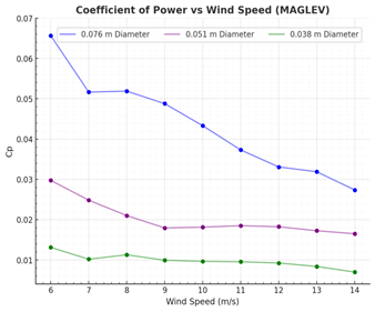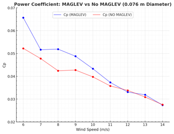 After all the testing and diagnosis, it is observed that the 0.076 m diameter cup (σ = 0.545) with MAGLEV performed the best. At the optimal wind speed of 6 m/s, the turbine demonstrated a power coefficient of 0.066 (6.6% efficiency) and a TSR of 0.56. The measured Cp = 0.066 for the Savonius wind turbine is significantly lower than the expected range (Cp = 0.15−0.20). This discrepancy is attributed to the generator’s mismatch with the turbine’s operational characteristics. Specifically, the generator requires a higher RPM to produce significant electrical power, while the turbine operates at low RPM with high torque. These factors collectively explain the observed low power coefficient, despite the turbine achieving an appropriate TSR of 0.56. With the budget being limited, we tried our best to get the most suited generator within the scope of the project.