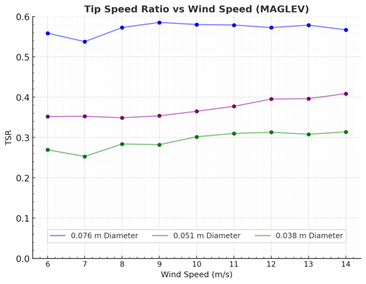 In Figure 8b, a graph is shown comparing the TSR at different wind speeds. It is seen that the 0.076 m diameter blades are performing significantly better than the 0.051 m and 0.038 m diameter blades. At first glance, it would not make sense for a heavier blade to be rotating faster than a lighter blade. After taking Figure 8a into account, one can see that a larger surface area cup can catch a notable amount of wind, allowing more torque and causing faster rotation.