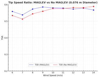 In “Design and Fabrication of Vertical Axis Wind Turbine with Magnetic Repulsion”,16 Nandurkar et. al. studied the MAGLEV system in a wind turbine to apply in very low wind speeds of around 1 m/s. Their goal was to achieve a very low self-starting capability and allow the turbine to run continuously even at very low speeds. They were able to get a self-start speed of 1.08 m/s which is low. While they were able to achieve a low self-start, the TSR was not high. It was not until the wind speed picked up that the TSR improved.